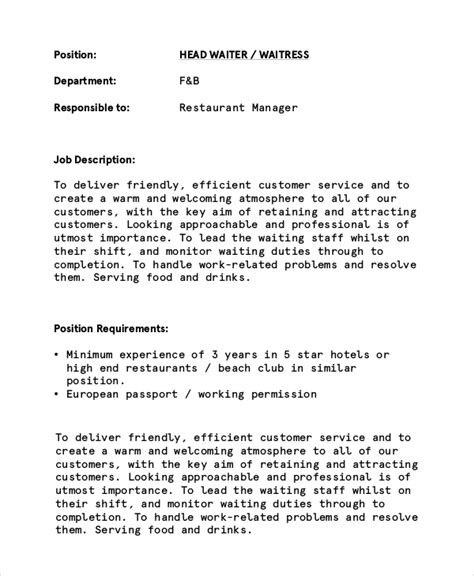 Cocktail Waitress Job Duties. In order to ensure your professional resume will support your goals, use this waiter/waitress job description to inform what you should highlight on your resume. Cocktail Waitress Responsibilities: Interacting with customers by taking their orders, making recommendations, providing them with accurate If there are specific cocktail server duties or skills you'd like included in your job description, simply add them to our cocktail waitress job description.