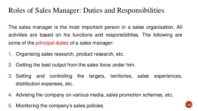 Duties Of A Sales Manager. Sales manager is accountable for gathering, recording, analysing and interpreting the facts about the character, quantity and trend of demand through marketing research. Three roles of a sales manager Day-to-day activities of a sales manager.